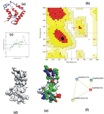 Fig:3D- In silico analysis of mosquito Ninjurin: (a) Secondary structure prediction of AsNinjL; (b) Ramachandran Plot analysis; (c) Prosa energy distribution of the molecular modeled mosquito Ninjurin; (d,e) Surface representation of the Ninjurin: two front views (d) one side view (e). Polar, negatively and positively charged atoms are shown in green, red and blue respectively; (g) STRING based network prediction analysis of AsNinjL